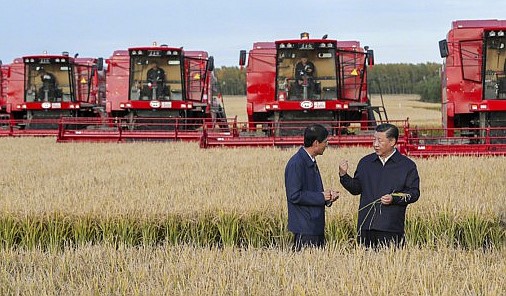 習(xí)近平來到黑龍江省撫遠(yuǎn)市玖成水稻種植專業(yè)合作社,了解合作社土地流轉(zhuǎn)和采用先進(jìn)種植技術(shù)提高水稻產(chǎn)量效益等情況。(圖片來源:新華視點(diǎn))