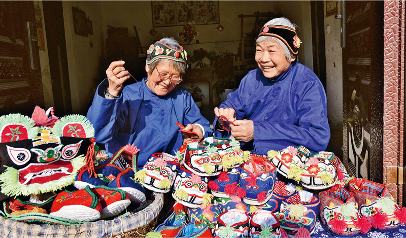 安徽省碭山縣關(guān)帝廟鎮(zhèn)小華樓村自古以來就有制作“虎頭鞋”、“虎頭帽”等兒童衣物的傳統(tǒng),自脫貧攻堅以來,該村積極引導(dǎo)、鼓勵留守婦女通過手工針線活增加收入、貼補家用,村民收入狀況明顯改觀。圖為2020年12月19日,市級非遺碭山虎頭鞋(虎頭帽)傳承人樊敏(左)和當(dāng)?shù)亓羰貗D女在加工傳統(tǒng)兒童鞋帽。 人民圖片 崔猛/攝