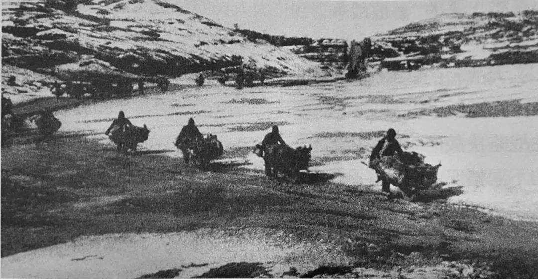 三大戰(zhàn)役期間,解放區(qū)農(nóng)民在冰天雪地中用小車(chē)把彈藥、物資運(yùn)往前線。圖片來(lái)源:《中國(guó)共產(chǎn)黨的九十年》