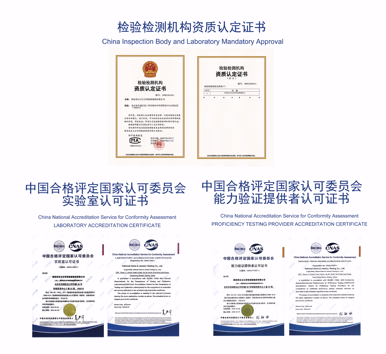 珠寶國(guó)檢是主管部門依法授權(quán)的珠寶玉石專業(yè)質(zhì)檢機(jī)構(gòu)。先后獲取檢驗(yàn)檢測(cè)機(jī)構(gòu)資質(zhì)認(rèn)定、中國(guó)合格評(píng)定國(guó)家認(rèn)可委員會(huì)實(shí)驗(yàn)室認(rèn)可證書(CNAS L0301)以及中國(guó)合格評(píng)定國(guó)家認(rèn)可委員會(huì)能力驗(yàn)證提供者認(rèn)可證書(CNAS PT0071)。