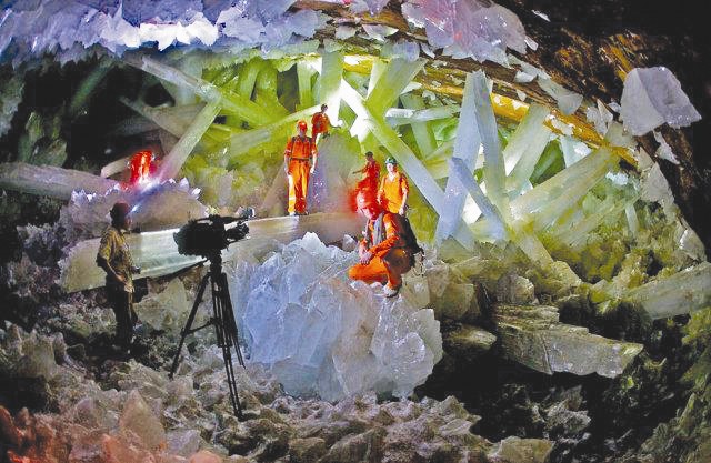 晶體生長的大小與其自身性質(zhì)和形成的地質(zhì)條件有關(guān)。通常情況下,礦物晶體由于受到空間限制,個(gè)體都不是很大,那么如果有足夠的空間與時(shí)間,晶體到底能長到多大呢?奈卡水晶洞是世界上最大的水晶洞穴,它位于墨西哥奇瓦瓦沙漠奈加山脈下305米深處。其洞穴內(nèi)長條的晶體是無水石膏晶體,這些半透明的巨型晶體長度達(dá)到了11米,重達(dá)55噸,非常巨大。