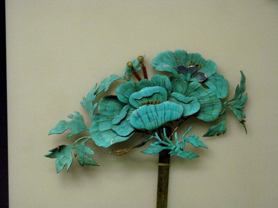 點翠工藝的高峰出現(xiàn)在清朝,由于繼承和發(fā)展了金屬制胎以及點翠羽等更為復雜的工藝形式,“點翠”逐漸發(fā)展成為一門獨特的金工技藝,隨即成為金銀制作中的重要工種。因為色彩光華艷麗且永不褪色,點翠頭飾也成為宮廷后妃十分流行的飾品?;蕦m后妃們幾乎所有的首飾都用點翠工藝作為裝飾,從鈿子、簪釵、頭花、耳環(huán),甚至到團扇、插屏、盆景等其他生活用品,處處翠色,成為風尚。