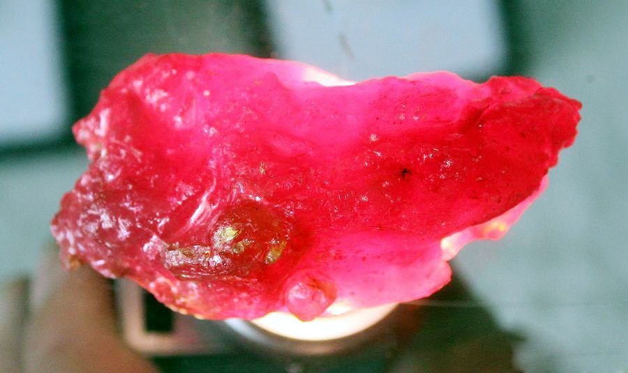 上海君道藝術(shù)展覽有限公司曾經(jīng)展出一塊緬甸頂級(jí)紅寶石原石,重760克,寶石顏色為頂級(jí)鴿血紅。原石是老坑石,高透明度的玻璃體,無雜質(zhì)、無裂紋。紅寶石體積較大,估計(jì)可達(dá)70%左右,在燈光照射時(shí)出現(xiàn)三束六射星光,把寶石放在暗室里,用射燈照射,寶石仿佛被燃燒了起來,原石的星光效應(yīng)非常明顯。