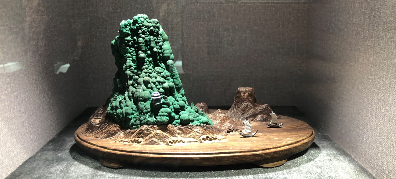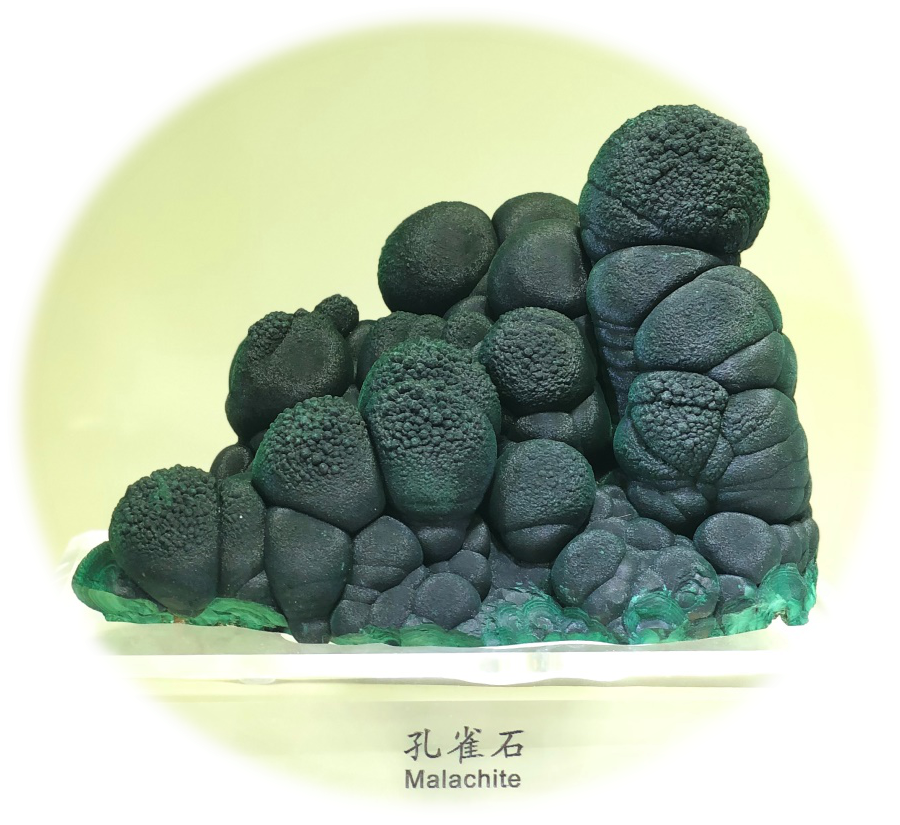 單體塊度較大的孔雀石以其各自獨特的姿態(tài),受到礦物晶體藏家喜愛,一般單體越大,價值越高,良石天成,稍加匠人雕琢,凸顯了天人合一的自然之美??兹甘瘑尉w多為細長的針狀、柱狀,集合體通常呈葡萄狀、鐘乳狀、放射狀、結核狀或同心環(huán)帶狀。我國的孔雀石主要產于廣東陽春、湖北大冶等地。廣東陽春產出的孔雀石形態(tài)多樣,鬼斧神工,奇妙至極;湖北大冶的孔雀石多為鐵銅氧化形成,質地致密,色澤濃艷,獨具特色。在中國地質博物館的展廳內,就展示了多件出自廣東陽春的精美孔雀石標本。