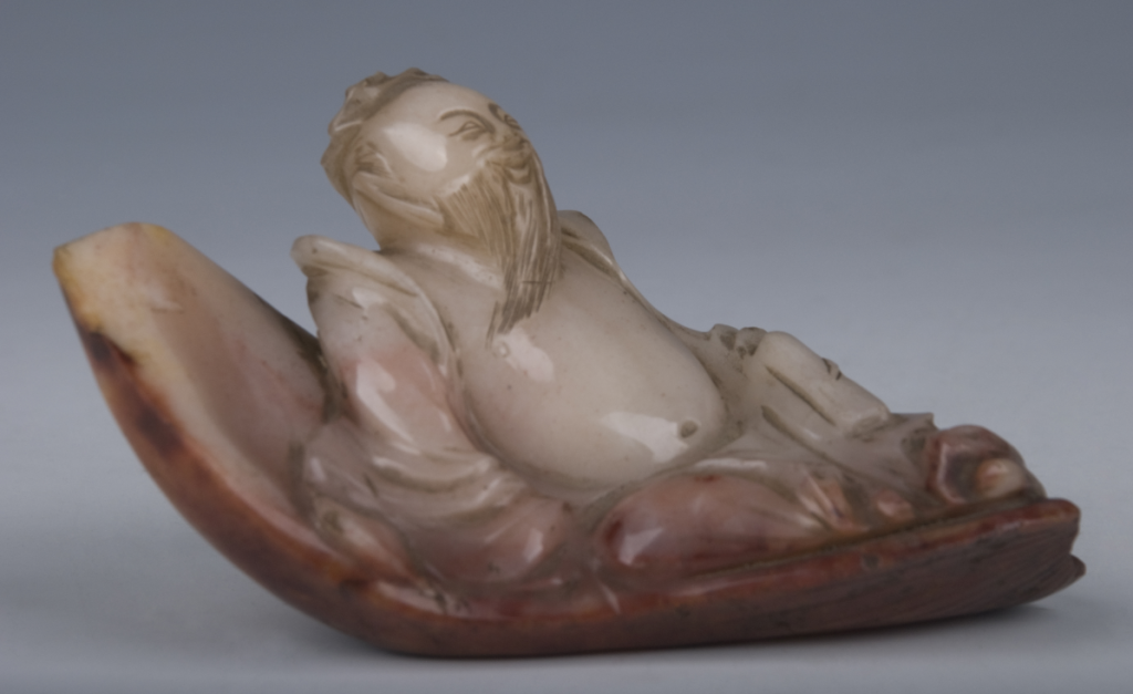 清乾隆瑪瑙人物,質(zhì)地為瑪瑙,保存完整,為瑪瑙巧雕。此雕刻為人物,雕一老漢,頭戴冠帽,面容慈祥,并帶微笑,長須飄于胸前,袒胸大肚,外披衣衫,左手握一書卷,臥于一蕉葉形座椅上,悠然自得。蕉葉底部有十一道紋,人體部位白色,蕉葉部為紅色。整個(gè)作品雕刻精細(xì),技法嫻熟,人物栩栩如生,是一件品質(zhì)極高的精美藝術(shù)品,彰顯了中國工匠精神。此瑪瑙人物為清代的擺件,現(xiàn)存于山東汶上縣中都博物館,三級(jí)文物。