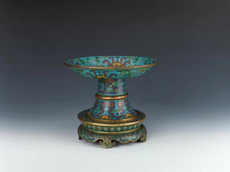 掐絲琺瑯寶相花紋高足盤,清代。銅胎鍍金,侈口、淺腹、喇叭形高圈足,束腰垂云式座。淺藍琺瑯釉為地,盤內(nèi)外飾寶相花紋;足飾夔鳳、變形獸面紋、如意云頭等紋,中部有一鎏金箍;底座飾如意云頭、蓮瓣、變形夔龍等紋。此盤胎體厚重,紋飾布局疏密得當(dāng),掐絲線條流暢,釉色純正溫潤。