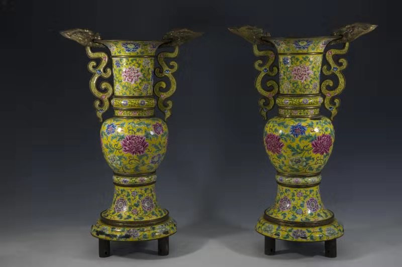 ——雍正黃地彩繪纏枝牡丹紋銅胎畫琺瑯尊