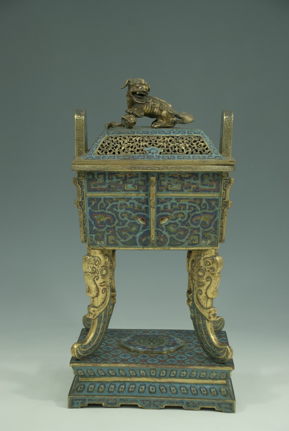 明獸面紋掐絲法瑯香爐,明代。該香爐為孔子博物館館藏一級文物“明獸面紋掐絲法瑯五供”之一,紫銅胎鍍金,器呈長方形,平口、出沿,立耳,直腹,平底,獸首吞足式四足,腹及四角皆有扉棱,帶蓋。蓋頂鑄獅鈕,蓋面鏤空,蓋面飾曲帶紋。腹及耳部飾變形夔龍紋和變形獸面紋。座為長方形,飾萬字紋、蓮瓣紋、“五蝠捧壽”紋。