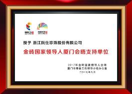 隨著中國(guó)高端珍珠走出中國(guó),在國(guó)際社會(huì)的活躍度增加,2017年9月金磚國(guó)家領(lǐng)導(dǎo)人會(huì)晤,阮仕被授予“金磚國(guó)家領(lǐng)導(dǎo)人廈門(mén)會(huì)晤支持單位”“金磚國(guó)家領(lǐng)導(dǎo)人廈門(mén)會(huì)晤指定產(chǎn)品”榮譽(yù)。
