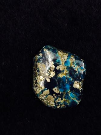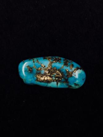 美國(guó)金曼綠松石——伊薩卡,該礦產(chǎn)出的綠松石顏色漂亮,為中—深藍(lán)色,質(zhì)地好,硬度高,常點(diǎn)綴著黃鐵礦,產(chǎn)地特征明顯,廣受歡迎。(樣品由北京靚工坊提供)