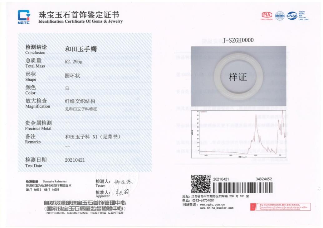 ▲珠寶國(guó)檢和田玉子料鑒定證書樣證