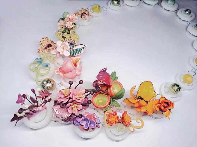 傳統(tǒng)珠寶首飾的色彩,主要由金屬本色和寶石色彩組成,局限性較大。而現(xiàn)代珠寶首飾,由于材料的不斷拓展和更新,色彩變得要加豐富和艷麗。作為與人互動密切的產(chǎn)品,首飾的色彩可以影響顧客的購買意向,所以在進(jìn)行首飾設(shè)計時,要對色彩有深刻的理解和靈活的運(yùn)用。