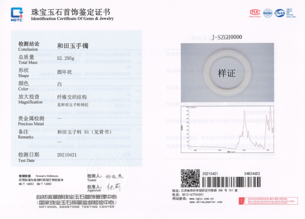 珠寶國檢(NGTC)蘇州實(shí)驗(yàn)室和田玉子料鑒定證書(樣證)