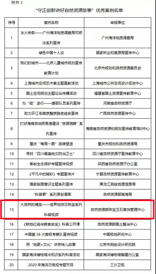 珠寶國檢(NGTC)《大自然的瑰寶——世界地球日珠寶系列科普視頻》榮獲“守正創(chuàng)新講好自然資源故事”優(yōu)秀案例稱號