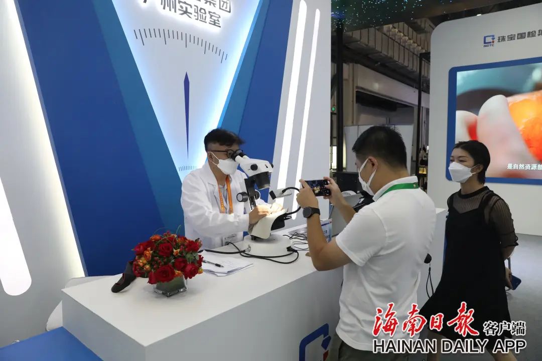 珠寶國檢集團廣州實驗室質檢師在消博會現(xiàn)場為消費者提供鑒定服務。海南日報記者 邱肖帥 攝