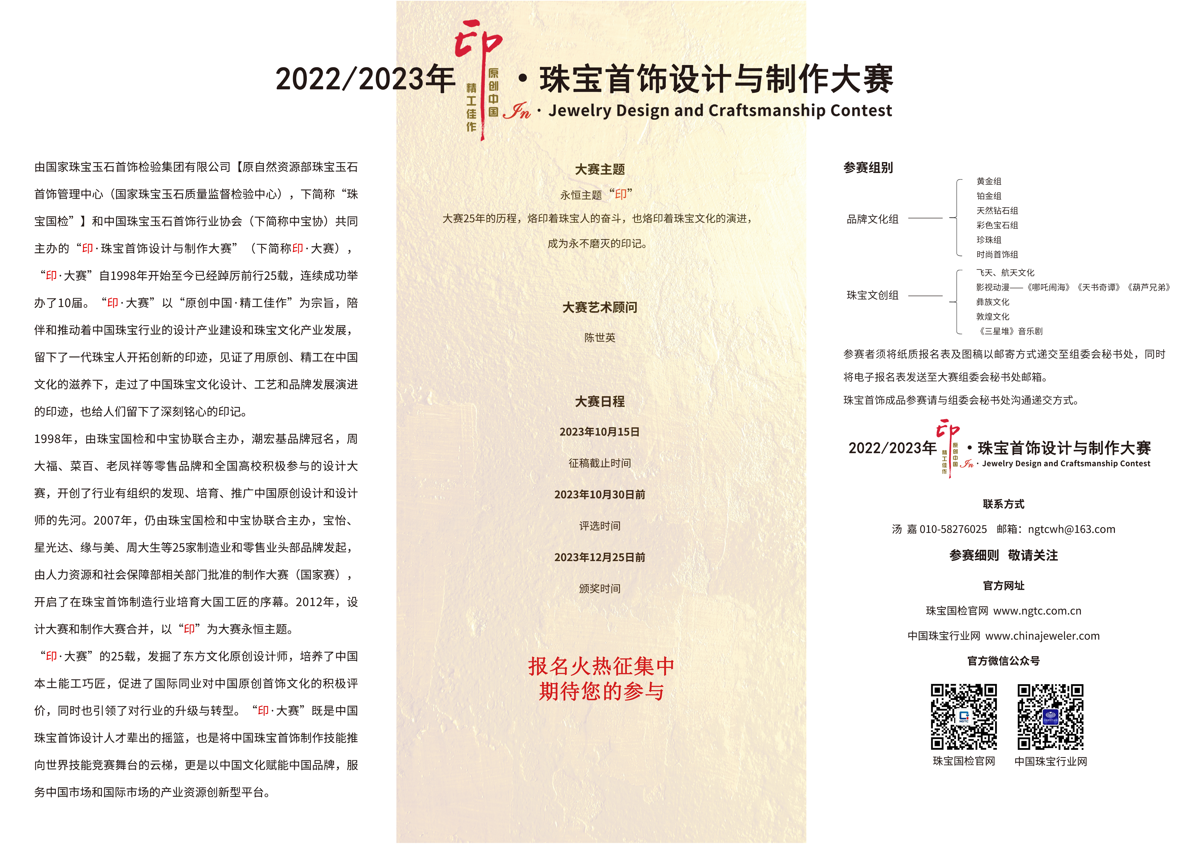 由國(guó)家珠寶玉石首飾檢驗(yàn)集團(tuán)有限公司【原自然資源部珠寶玉石首飾管理中心(國(guó)家珠寶玉石質(zhì)量監(jiān)督檢驗(yàn)中心),下簡(jiǎn)稱“珠寶國(guó)檢”】和中國(guó)珠寶玉石首飾行業(yè)協(xié)會(huì)(下簡(jiǎn)稱“中寶協(xié)”)共同主辦的“印·珠寶首飾設(shè)計(jì)與制作大賽”(下簡(jiǎn)稱“印·大賽”),自1998年開(kāi)始至今已經(jīng)踔厲前行25載,連續(xù)成功舉辦了10屆?!坝 ご筚悺币浴霸瓌?chuàng)中國(guó)·精工佳作”為宗旨,陪伴和推動(dòng)著中國(guó)珠寶行業(yè)的設(shè)計(jì)產(chǎn)業(yè)建設(shè)和珠寶文化產(chǎn)業(yè)發(fā)展,留下了一代珠寶人開(kāi)拓創(chuàng)新的印跡,見(jiàn)證了用原創(chuàng)、精工在中國(guó)文化的滋養(yǎng)下,走過(guò)了中國(guó)珠寶文化設(shè)計(jì)、工藝和品牌發(fā)展演進(jìn)的印跡,也給人們留下了深刻銘心的印記。