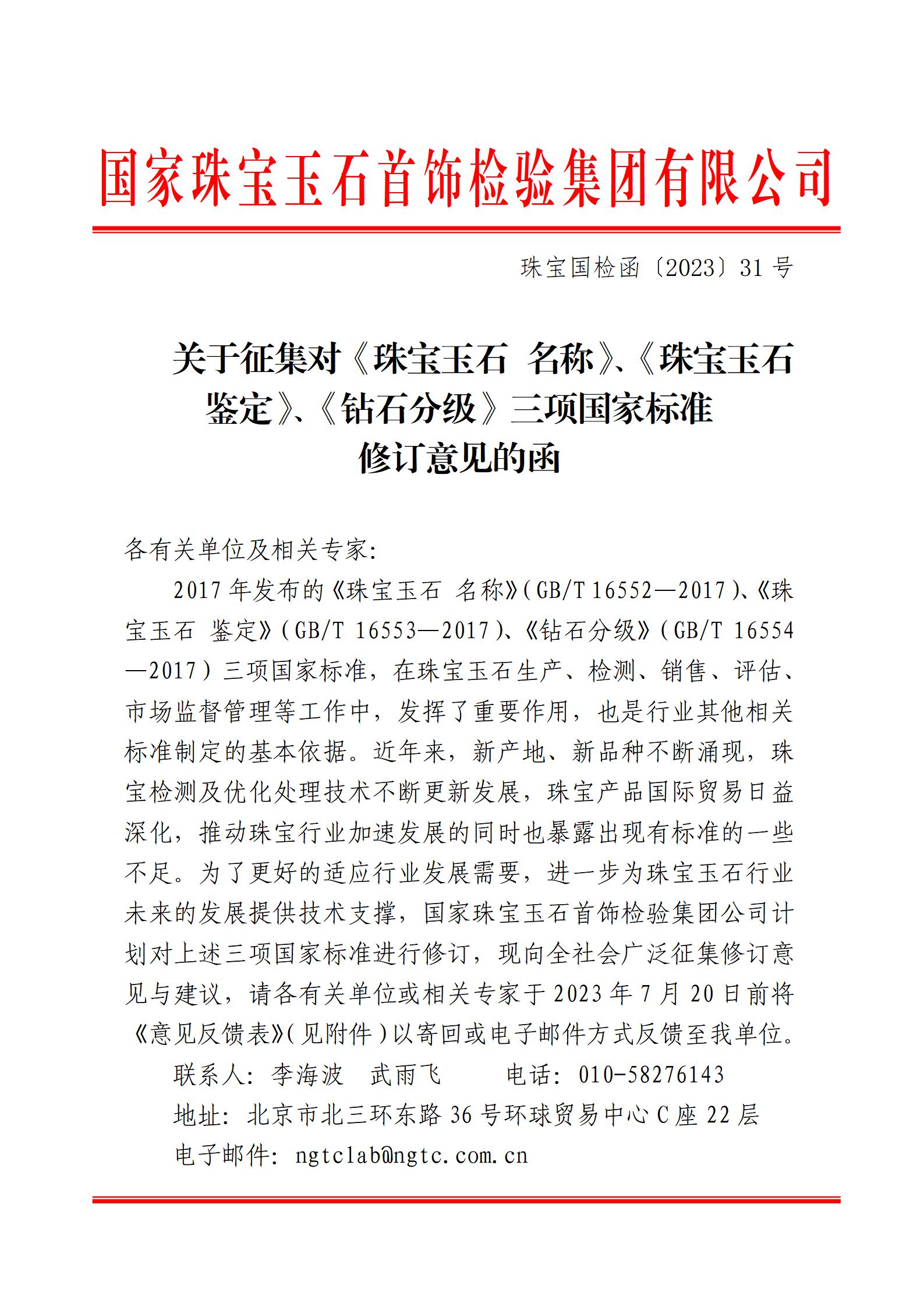 關(guān)于征集對《珠寶玉石 名稱》、《珠寶玉石 鑒定》、《鉆石分級》三項(xiàng)國家標(biāo)準(zhǔn)修訂意見的函