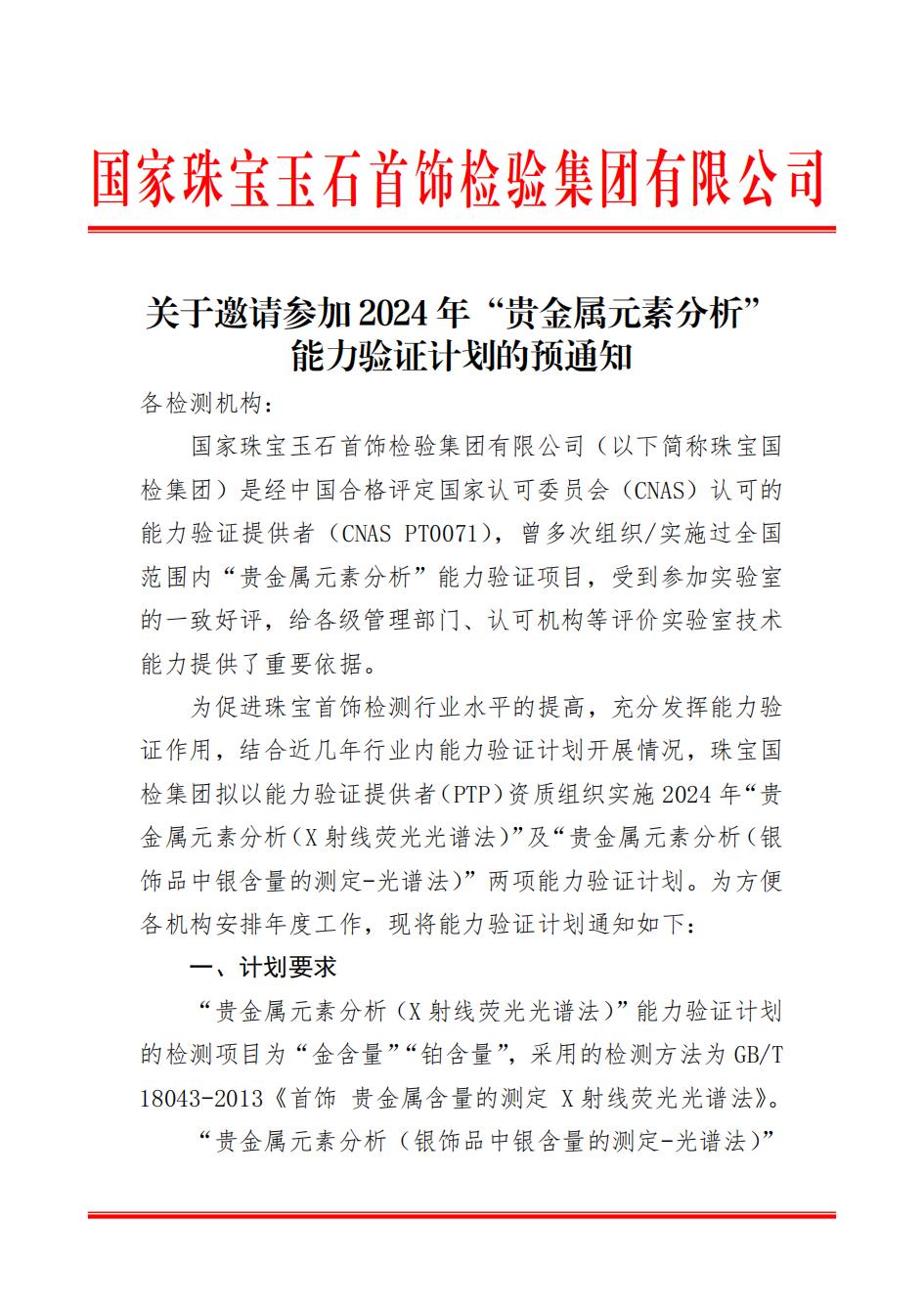 關于邀請參加2024年“貴金屬元素分析”能力驗證計劃的預通知