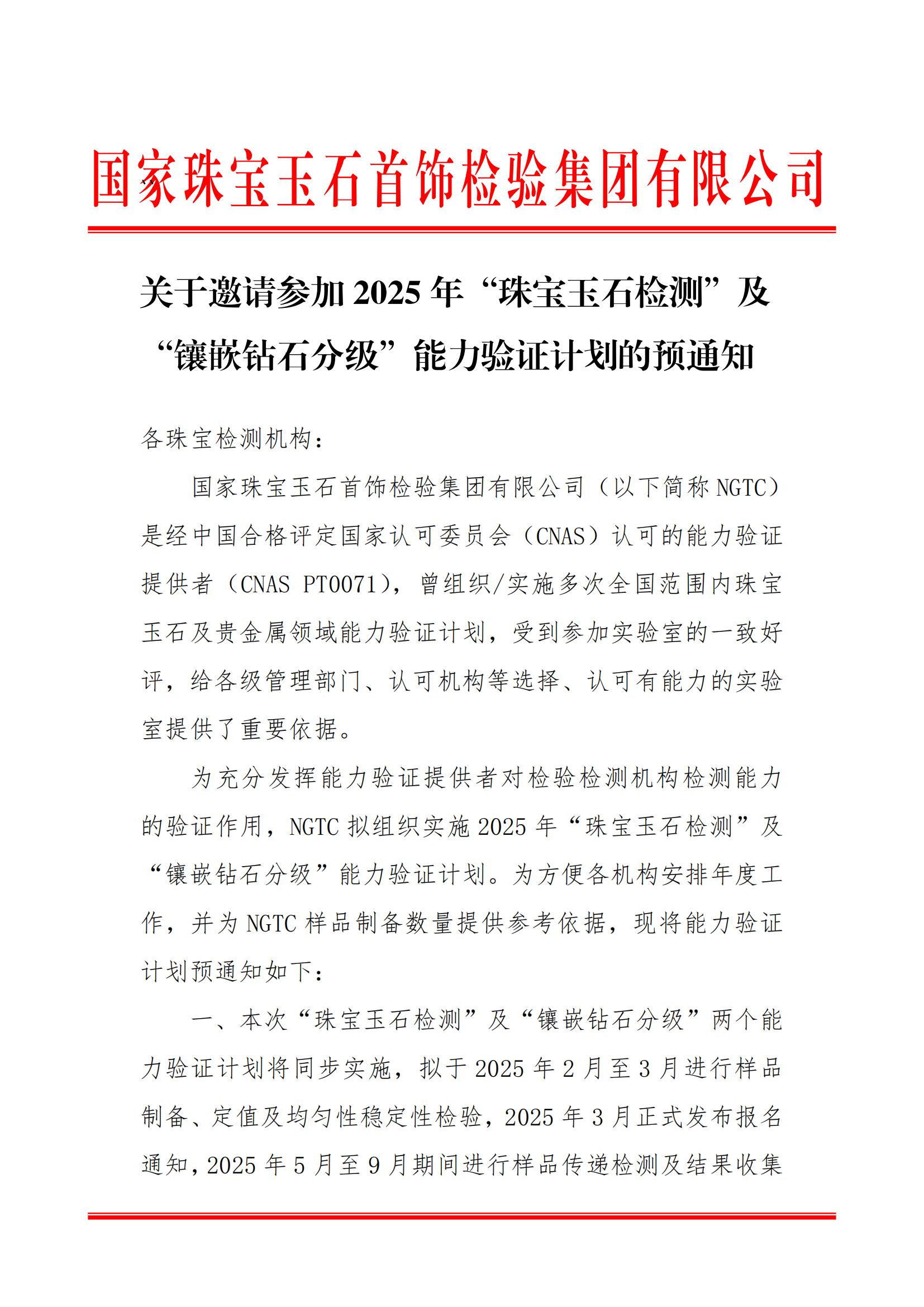 關于邀請參加2025年“珠寶玉石檢測”及“鑲嵌鉆石分級”能力驗證計劃的通知