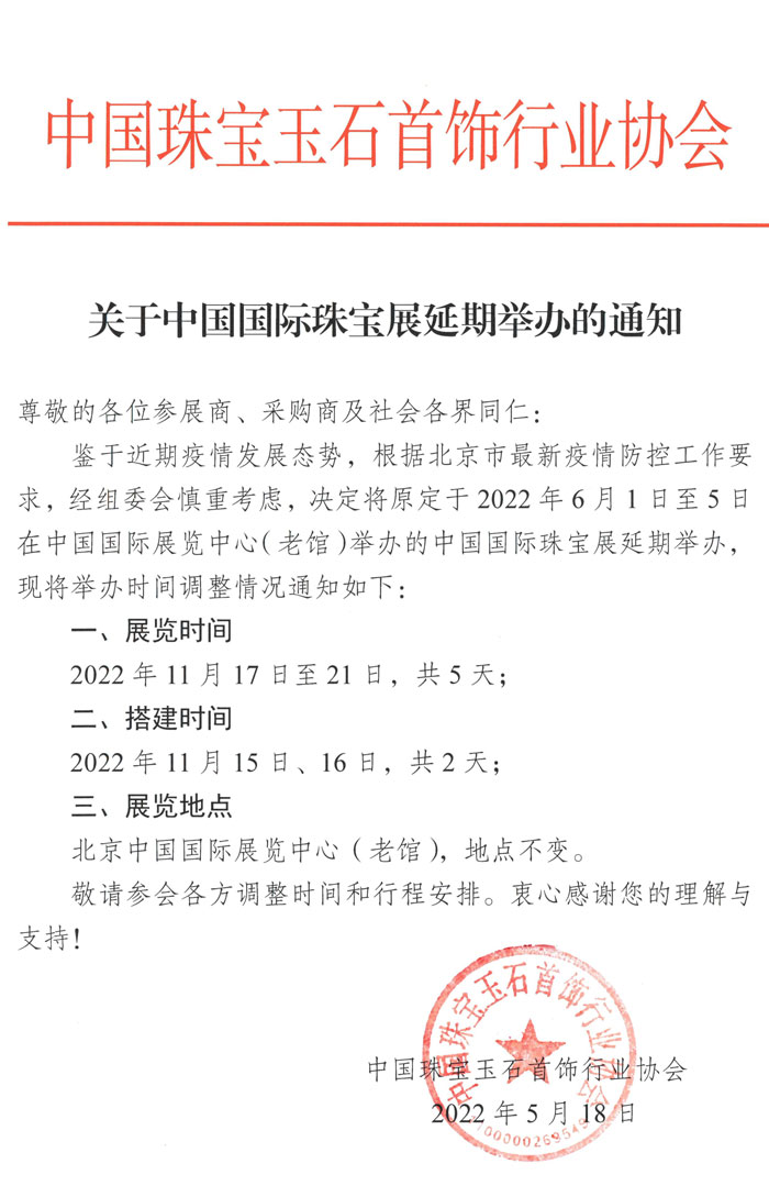 關(guān)于中國(guó)國(guó)際珠寶展延期舉辦的通知