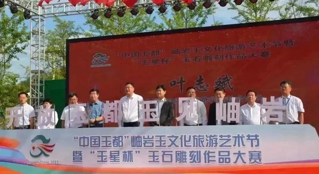 中寶協(xié)會長葉志斌宣布2023“中國玉都”岫巖玉文化旅游藝術節(jié)暨“玉星杯”玉石雕刻作品展開幕。