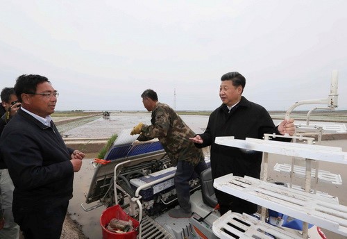 習(xí)近平來到黑龍江省撫遠(yuǎn)市玖成水稻種植專業(yè)合作社,了解合作社土地流轉(zhuǎn)和采用先進(jìn)種植技術(shù)提高水稻產(chǎn)量效益等情況。(圖片來源:新華視點(diǎn))