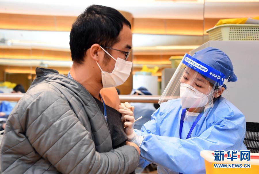 2月22日,在北京市海淀區(qū)中關(guān)村軟件園二期一家企業(yè)內(nèi)的臨時接種點,醫(yī)務(wù)人員為企業(yè)員工接種新冠疫苗。新華社記者 任超 攝