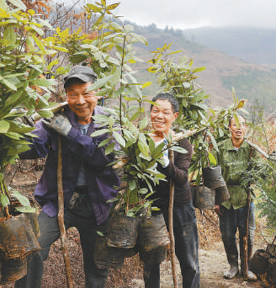 今年3月,浙江省麗水市景寧畬族自治縣鸕鶿鄉(xiāng)西林村,村民挑著樹苗前往山地種植。李肅人攝(影像中國)