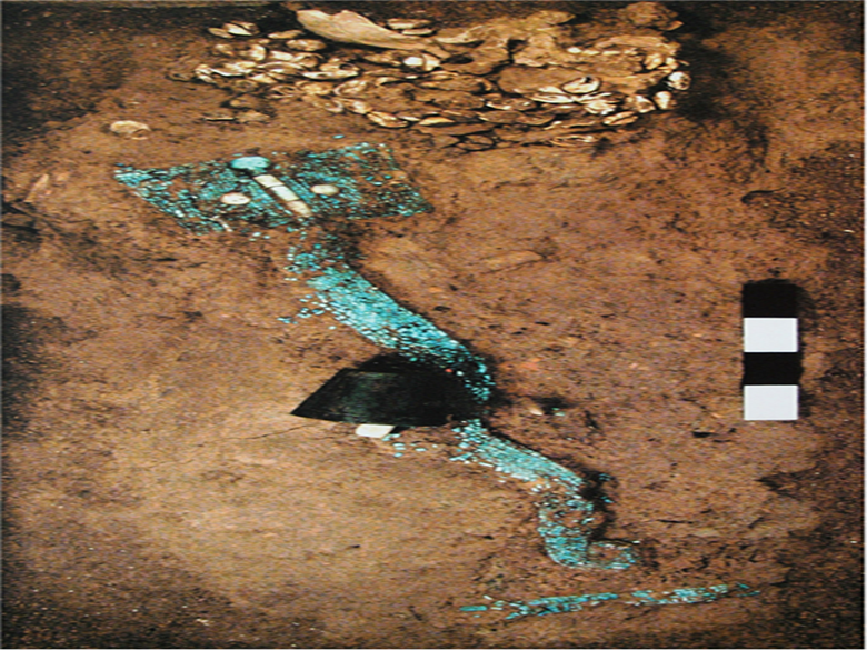 這件綠松石龍形器龍身長64.5厘米,由2000余片菱形鱗紋綠松石片組合而成。巨頭蜷尾,龍身曲伏有致,色彩絢麗,形象生動。扁圓形龍頭伸出多條龍須或鬢,吻部微突出,額面中脊、鼻梁明顯,鼻梁由三節(jié)半圓形的青、白玉柱組成,蒜頭狀鼻端由綠松石雕成,梭形眼眶對稱,眼珠為圓餅形白玉。距龍形器尾端不遠(yuǎn)處,還有一個綠松石條形飾,與龍?bào)w的角度近乎垂直,宛若一條游龍。